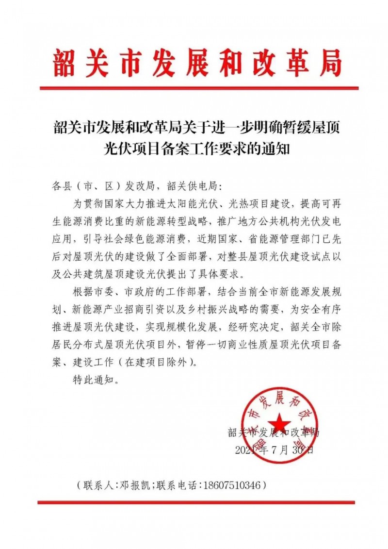 韶關(guān)市發(fā)展和改革局關(guān)于進(jìn)一步明確暫緩屋頂光伏項(xiàng)目備案工作要求的通知
