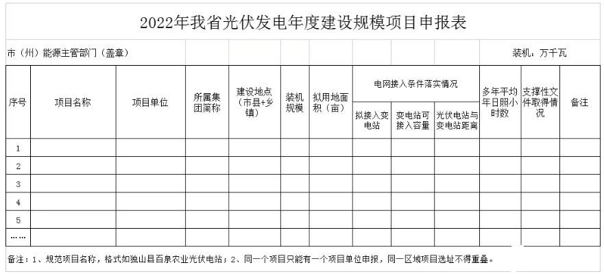 為積極貫徹落實國家“碳達峰、碳中和”工作目標(biāo),實現(xiàn)我省能源產(chǎn)業(yè)轉(zhuǎn)型、高質(zhì)量發(fā)展,有序推進新能源項目建設(shè),根據(jù)《貴州省風(fēng)電光伏發(fā)電項目管理暫行辦法》,現(xiàn)開展我省2022年風(fēng)電光伏發(fā)電年度建設(shè)規(guī)模項目申報工作,有關(guān)事項通知如下: