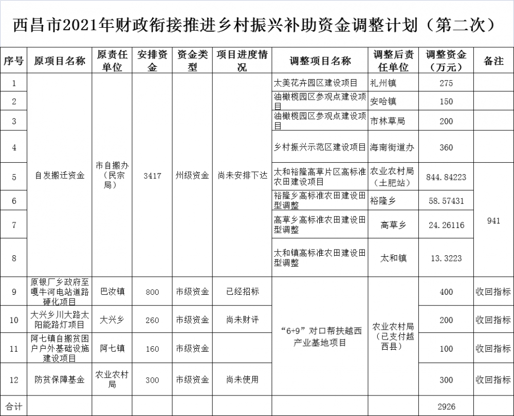 根據(jù)西昌市鄉(xiāng)村振興局《關(guān)于再次調(diào)整使用2021年銜接推進(jìn)鄉(xiāng)村振興補助資金的請示》(西鄉(xiāng)振發(fā)(2021)18號)文件及領(lǐng)導(dǎo)批示,現(xiàn)將2021年下達(dá)市委統(tǒng)戰(zhàn)部(自搬辦):1、自發(fā)搬遷資金1926萬元調(diào)整到禮州鎮(zhèn)太美花卉園區(qū)建設(shè)項目275萬元、 安哈鎮(zhèn)油橄欖園區(qū)參觀點建設(shè)項目150萬元、市林草局油橄欖園區(qū)參觀點建設(shè)項目200萬元、海南街道辦事處鄉(xiāng)村振興示范區(qū)建設(shè)項目360萬元、太和裕隆高草片區(qū)高標(biāo)準(zhǔn)農(nóng)田建設(shè)項目941萬元;2、收回以下單位指標(biāo):⑴、巴汝鎮(zhèn)原銀廠鄉(xiāng)政府至嘎牛河電站道路硬化項目資金400萬元;⑵、大興鄉(xiāng)川大路太陽能路燈項目資金200萬元;⑶、阿七鎮(zhèn)自搬貧困戶戶外基礎(chǔ)設(shè)施建設(shè)項目資金100萬元;⑷、農(nóng)業(yè)農(nóng)村局防貧保障基金300萬元;3、將西昌市援建越西縣 “6+9”對口幫扶越西產(chǎn)業(yè)基地項目1000萬元調(diào)入鄉(xiāng)村振興項目,給予在網(wǎng)上公示。