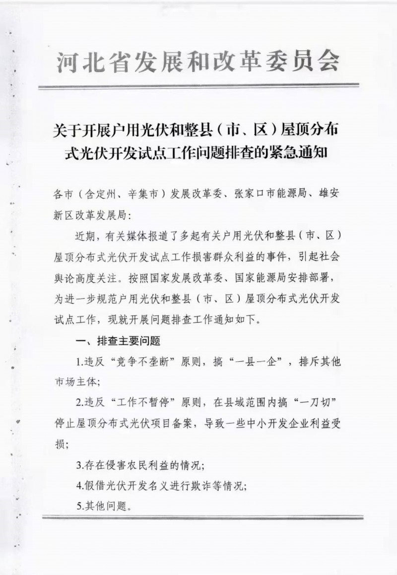 12月21日,河北省發(fā)改委下發(fā)《關(guān)于開展戶用光伏和整縣(市、區(qū))屋頂分布式光伏開發(fā)試點工作問題排查的緊急通知》,文件指出:近期有關(guān)媒體報道多起有關(guān)戶用光伏和整縣(市、區(qū))屋頂分布式光伏開發(fā)試點工作損害群眾利益的事件,引發(fā)社會輿論高度關(guān)注。按照國家發(fā)展改革委、國家能源局安排部署,為進一步規(guī)范戶用光伏和整縣(市、區(qū))屋頂分布式光伏開發(fā)試點工作,開展問題排查工作。有關(guān)排查工作情況,于12月28日上報。