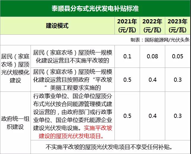 居民(家庭農(nóng)場)屋頂統(tǒng)一規(guī)?;ㄔO(shè)運營且按照政府“平改坡”美麗工程要求實施的,在光伏發(fā)電項目建成、并網(wǎng)和驗收后給予居民發(fā)放一次性平改坡建設(shè)補(bǔ)貼。2021年、2022年、2023年建成、并網(wǎng)和驗收的實行差異化補(bǔ)貼,補(bǔ)貼標(biāo)準(zhǔn)分別為0.5元/瓦、0.4元/瓦、0.3元/瓦。