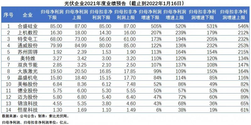 根據(jù)上交所和深交所的規(guī)定,上市企業(yè)上一年的年度經(jīng)營業(yè)績同比增長或下降超過50%,需要在當年的1月31日前發(fā)布業(yè)績預告。在光伏企業(yè)2021年前三季度經(jīng)營業(yè)績集體大漲的背景下,相信在接下來不到半個月的時間里,還會有更多的光伏企業(yè)披露業(yè)績預告。