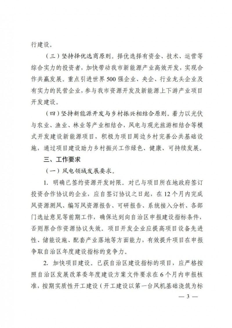 已獲自治區(qū)建設(shè)指標(biāo)的項(xiàng)目,應(yīng)嚴(yán)格按照自治區(qū)發(fā)展改革委年度建設(shè)方案文件要求在6個月內(nèi)申報核準(zhǔn),按期實(shí)質(zhì)性開工建設(shè)(開工建設(shè)以第一臺風(fēng)機(jī)基礎(chǔ)澆筑為標(biāo)志)、完工和實(shí)現(xiàn)并網(wǎng)發(fā)電,否則取消項(xiàng)目建設(shè)權(quán)限。