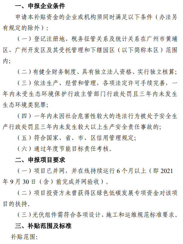 3月14日,廣州黃埔區(qū)、開發(fā)區(qū)發(fā)布了“關(guān)于組織開展2022年度第一批分布式光伏發(fā)電項(xiàng)目投資方發(fā)電量補(bǔ)貼資金申報(bào)工作的通知”。通知明確:補(bǔ)貼范圍為2021年5月20日至2022年2月28日期間的發(fā)電量。補(bǔ)貼標(biāo)準(zhǔn)為:應(yīng)用方(屋頂方)為非公共機(jī)構(gòu)的按 0.15 元/千瓦時(shí);應(yīng)用方(屋頂方)為公共機(jī)構(gòu)的按 0.3 元/千瓦時(shí)。