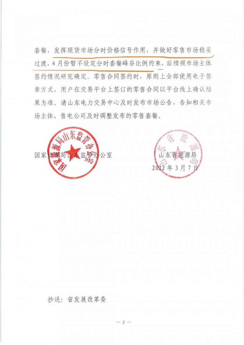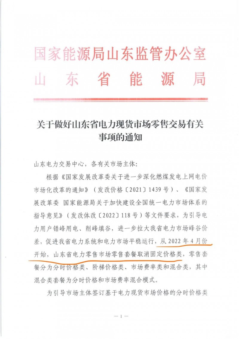 在此次交易公告發(fā)布之前,本月另一份文件的印發(fā)也相當(dāng)重要:3月7日,山東政府發(fā)布《關(guān)于做好山東省電力現(xiàn)貨市場零售交易有關(guān)事項(xiàng)的通知》,宣布從4月起,山東零售市場取消固定費(fèi)率套餐,引導(dǎo)市場主體簽訂基于山東現(xiàn)貨市場價格的分時價格類套餐。(下圖)
