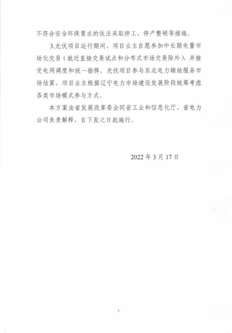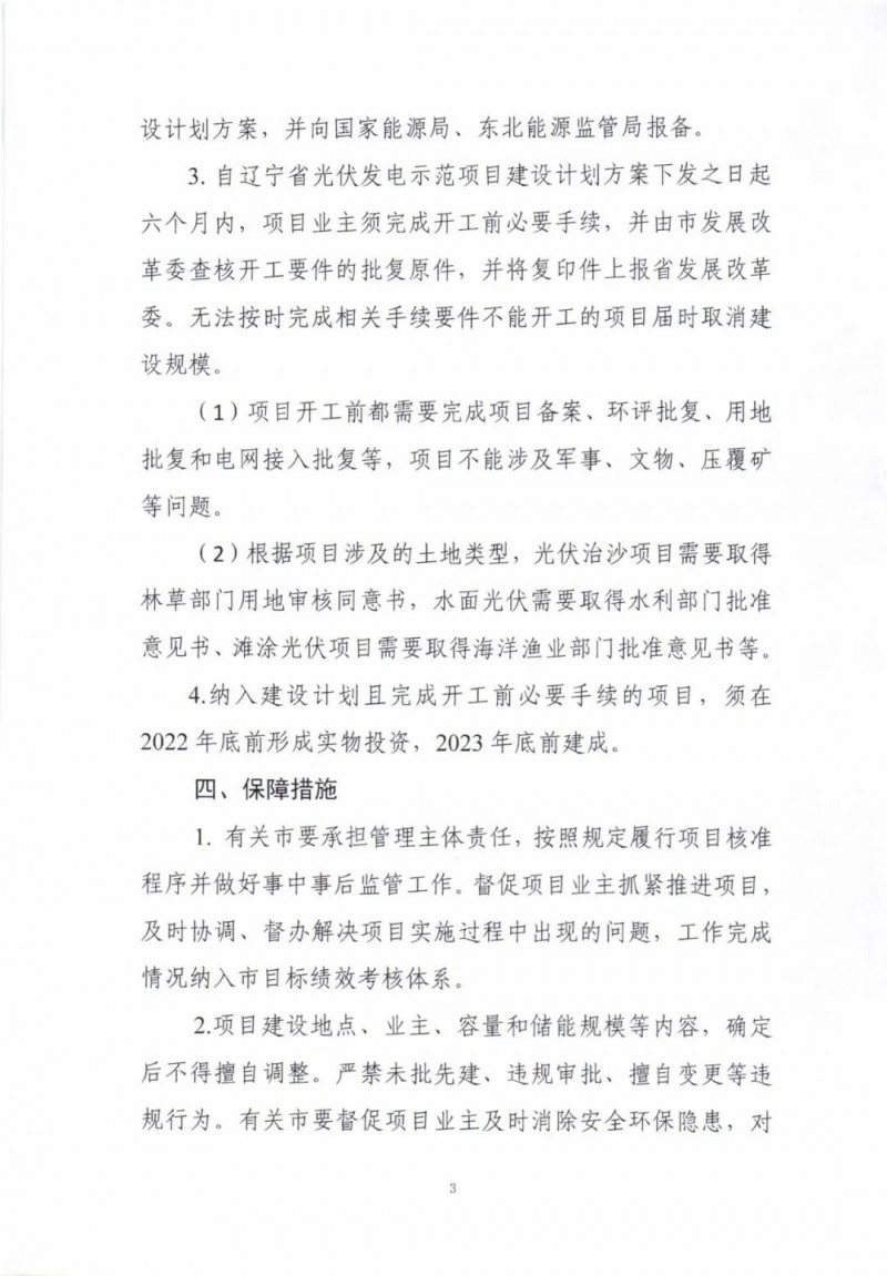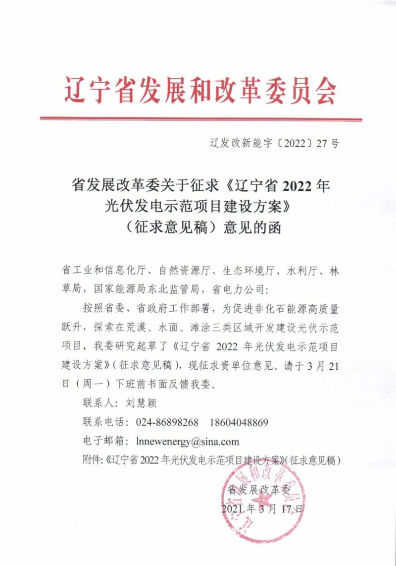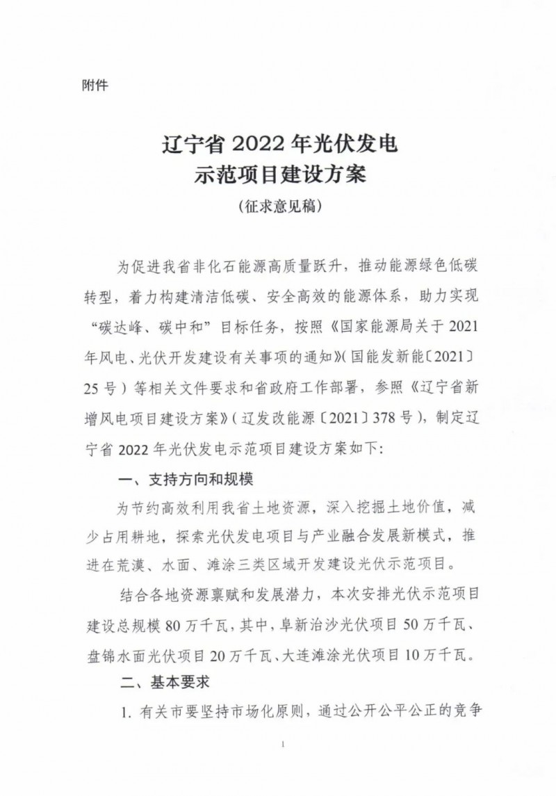 近日,遼寧省發(fā)改委下發(fā)《遼寧省2022年光伏發(fā)電示范項目建設(shè)方案》(征求意見稿)。文件表示,為節(jié)約高效利用我省土地資源,深入挖掘土地價值,減少占用耕地,探索光伏發(fā)電項目與產(chǎn)業(yè)融合發(fā)展新模式,推進(jìn)在荒漠、水面、灘涂三類區(qū)域開發(fā)建設(shè)光伏示范項目。結(jié)合各地資源稟賦和發(fā)展?jié)摿Γ敬伟才殴夥痉俄椖拷ㄔO(shè)總規(guī)模80萬千瓦,其中,阜新治沙光伏項目50萬千瓦、盤錦水面光伏項目20萬千瓦、大連灘涂光伏項目10萬千瓦。
