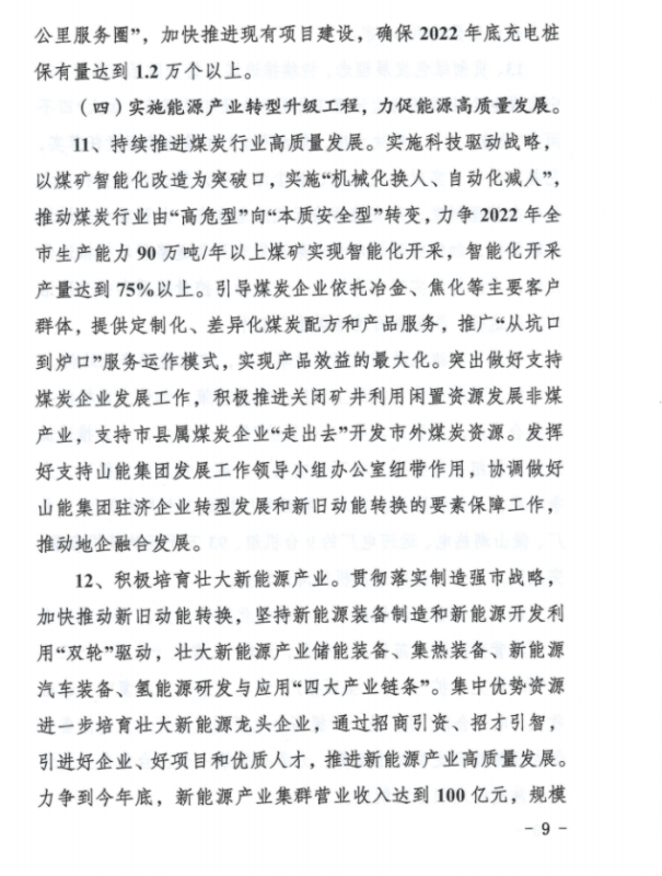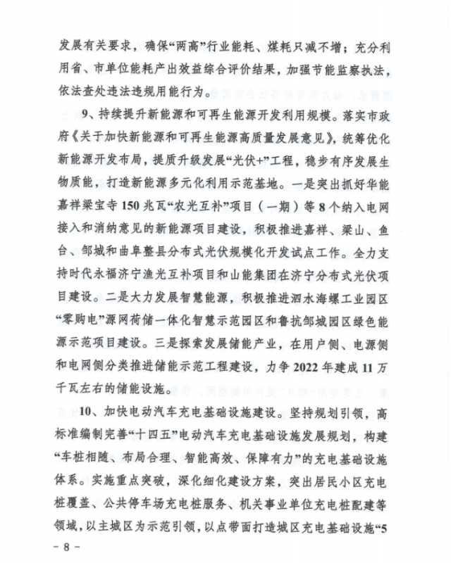 持續(xù)提升新能源和可再生能源開發(fā)利用規(guī)模。落實(shí)市政府《關(guān)于加快新能源和可再生能源高質(zhì)量發(fā)展意見》,統(tǒng)籌優(yōu)化新能源開發(fā)布局,提質(zhì)升級(jí)發(fā)展“光伏+”工程,穩(wěn)步有序發(fā)展生物質(zhì)能,打造新能源多元化利用示范基地。一是突出抓好華能嘉祥梁寶寺150兆瓦“農(nóng)光互補(bǔ)”項(xiàng)目(一期)等8個(gè)納入電網(wǎng)接入和消納意見的新能源項(xiàng)目建設(shè),積極推進(jìn)嘉祥、梁山、魚臺(tái)、鄒城和曲阜整縣分布式光伏規(guī)?;_發(fā)試點(diǎn)工作。全力支持時(shí)代永福濟(jì)寧漁光互補(bǔ)項(xiàng)目和山能集團(tuán)在濟(jì)寧分布式光伏項(xiàng)目建設(shè)。二是大力發(fā)展智慧能源,積極推進(jìn)泗水海螺工業(yè)園區(qū)“零購電”源網(wǎng)荷儲(chǔ)一體化智慧示范園區(qū)和魯抗鄒城園區(qū)綠色能源示范項(xiàng)目建設(shè)。三是探索發(fā)展儲(chǔ)能產(chǎn)業(yè),在用戶側(cè)、電源側(cè)和電網(wǎng)側(cè)分類推進(jìn)儲(chǔ)能示范工程建設(shè),力爭2022年建成11萬千瓦左右的儲(chǔ)能設(shè)施。