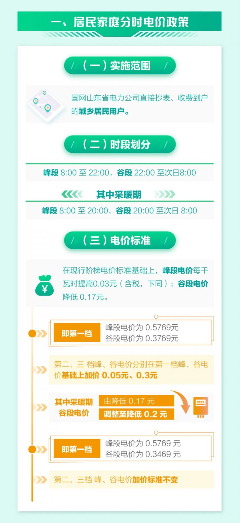電價(jià)標(biāo)準(zhǔn):在現(xiàn)行階梯電價(jià)標(biāo)準(zhǔn)基礎(chǔ)上,峰段電價(jià)每千瓦時(shí)提高0.03元(含稅,下同);谷段電價(jià)降低0.17元。即第一檔峰段電價(jià)為0.5769元、谷段電價(jià)為0.3769元,第二、三檔峰、谷電價(jià)分別在第一檔峰、谷電價(jià)基礎(chǔ)上加價(jià)0.05元、0.3元;其中采暖期谷段電價(jià)由降低0.17元調(diào)整至降低0.2元。即第一檔峰段電價(jià)為0.5769元、谷段電價(jià)為0.3469元,第二、三檔峰、谷電價(jià)加價(jià)標(biāo)準(zhǔn)不變。