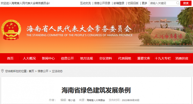 《海南省綠色建筑發(fā)展條例》已由海南省第六屆人民代表大會(huì)常務(wù)委員會(huì)第三十八次會(huì)議于2022年9月29日通過(guò),現(xiàn)予公布,自2023年1月1日起施行。