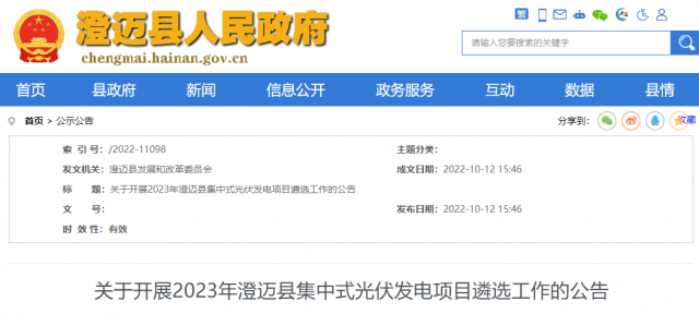 10月12日,海南澄邁縣政府網(wǎng)發(fā)布“關(guān)于開展2023年澄邁縣集中式光伏發(fā)電項(xiàng)目遴選工作的公告”。