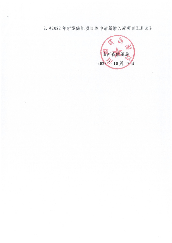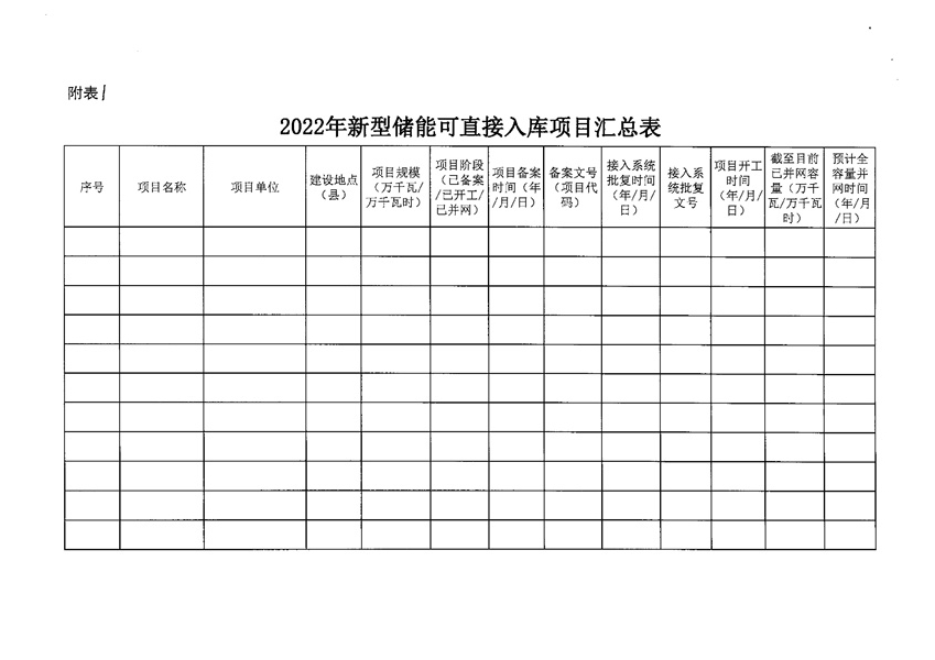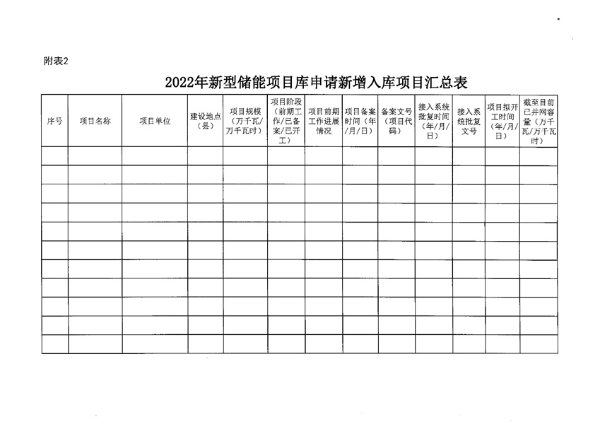 請各企業(yè)認真閱讀省能源局通知內(nèi)容,并于10月26日前將《2022年新型儲能可直接入庫項目匯總表》、《2022年新型儲能申請新增入庫項目匯總表》及相關證明材料的電子版(加蓋企業(yè)公章的PDF版和可編輯Excel版)發(fā)送至郵箱:[email protected],逾期不再受理。