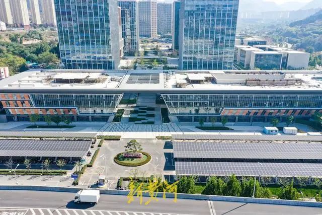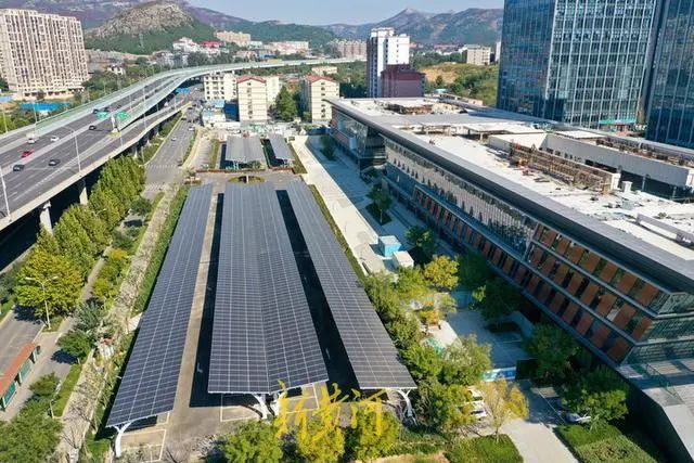 10月19日,濟(jì)南市中區(qū)山東大學(xué)國家大學(xué)科技園的露天停車場新加裝了光伏車棚,光伏停車場在高空俯瞰之下格外壯觀。