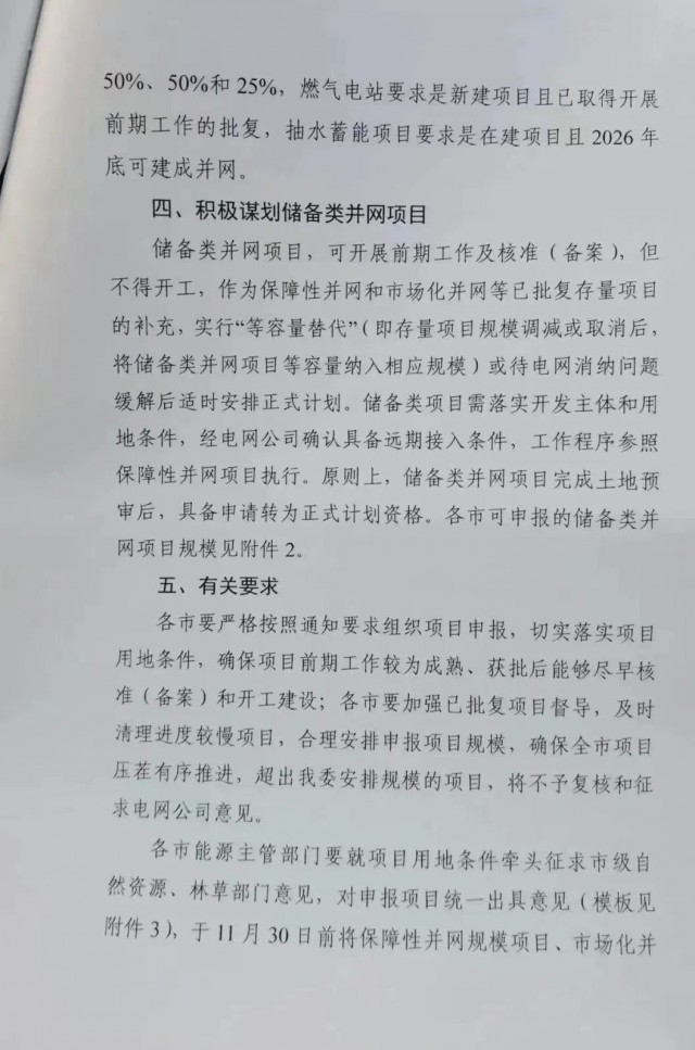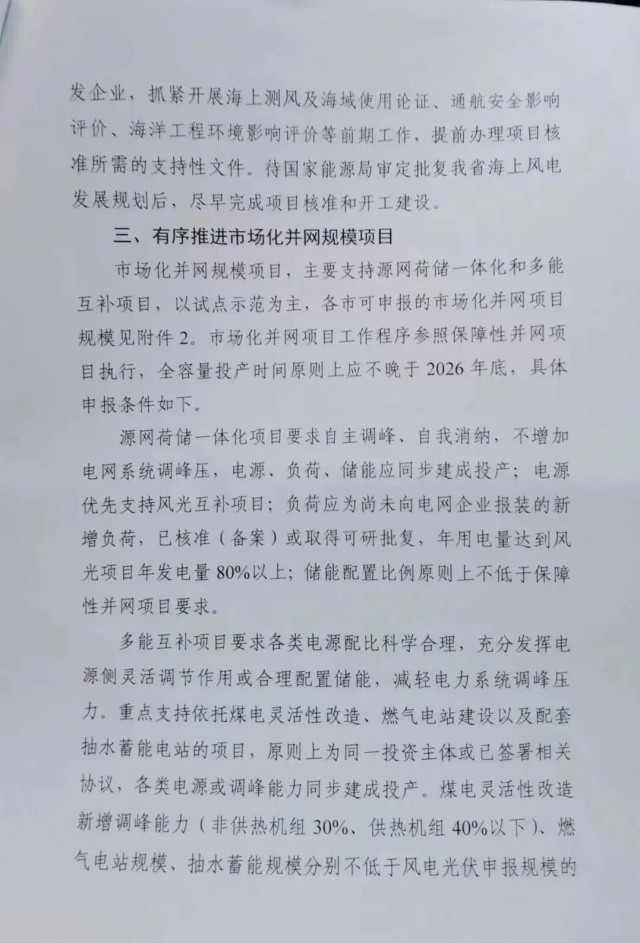 市場化項目參照保障性并網(wǎng)項目執(zhí)行,源網(wǎng)荷儲一體化項目年用電量要達到風(fēng)、光項目年發(fā)電量的80%以上,儲能配置要求不得低于保障性項目。多能互補項目煤電新增調(diào)峰能力、燃氣電站、抽水蓄能規(guī)模不得低于風(fēng)、光申報規(guī)模的50%、50%、25%。市場化項目全容量投產(chǎn)時間不晚于2026年底。