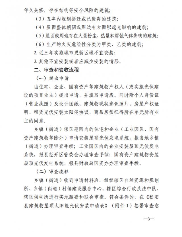 1、適用范圍:適用于松陽縣縣域范圍內(nèi)合法住宅、企業(yè)、國有資產(chǎn)建筑物等屋頂及部分建筑露臺安裝光伏發(fā)電系統(tǒng),并說明補充5類不得安裝或不宜安裝及減少安裝的情形。