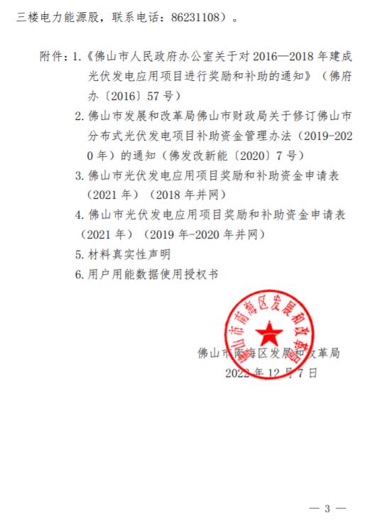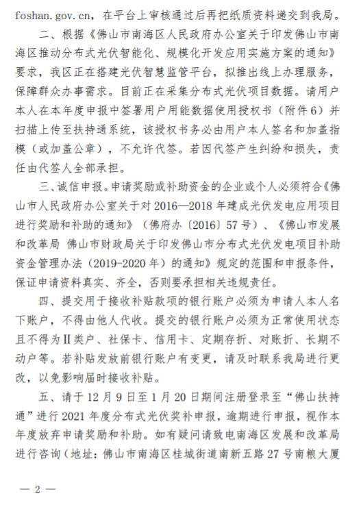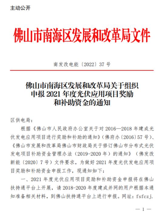 12月8日,廣東省佛山市南海區(qū)發(fā)改局發(fā)布《關(guān)于組織申報2021年度光伏應用項目獎勵和補助資金的通知》,2021年度光伏應用項目獎勵和補助資金申報將在佛山扶持通平臺上開展,請2018-2020年度建成并網(wǎng)的用戶根據(jù)本通知準備相關(guān)材料,到佛山扶持通平臺上進行申報。