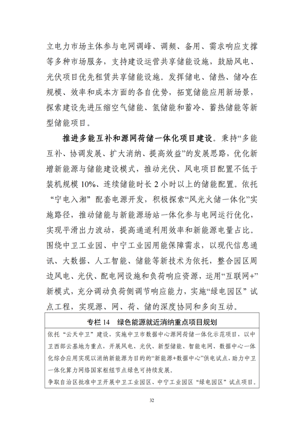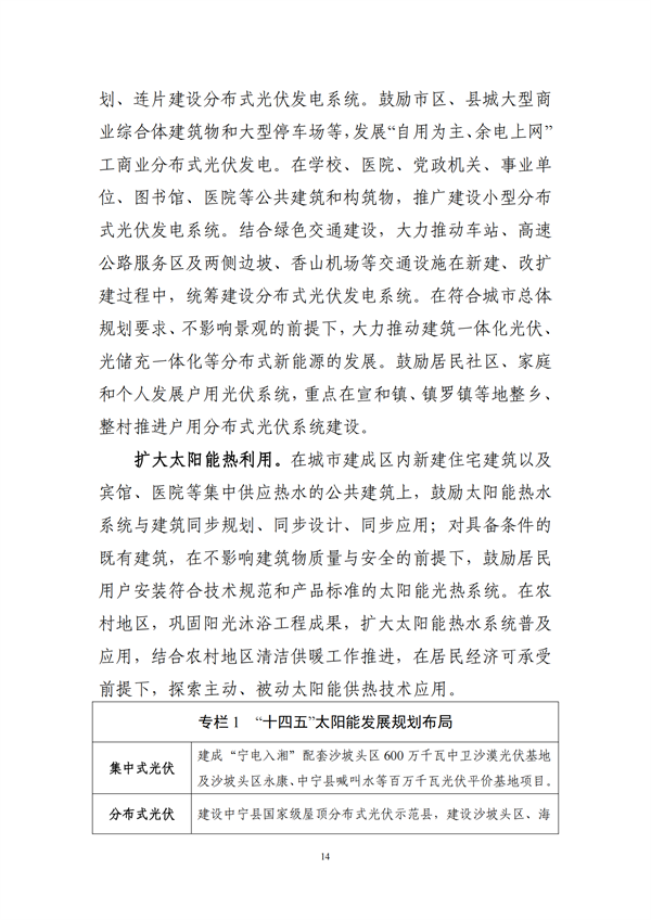 加快開發(fā)分布式光伏資源。開展中寧縣、沙坡頭區(qū)、海原縣整縣屋頂分布式光伏開發(fā)試點。在中衛(wèi)工業(yè)園區(qū)、中寧工業(yè)園區(qū)和海興開發(fā)區(qū),科學(xué)選取工業(yè)廠房及附屬空閑場地,統(tǒng)一規(guī)劃、連片建設(shè)分布式光伏發(fā)電系統(tǒng)。在學(xué)校、醫(yī)院、黨政機關(guān)、事業(yè)單位、圖書館、醫(yī)院等公共建筑和構(gòu)筑物,推廣建設(shè)小型分布式光伏發(fā)電系統(tǒng)。結(jié)合綠色交通建設(shè),大力推動車站、高速公路服務(wù)區(qū)及兩側(cè)邊坡、香山機場等交通設(shè)施在新建、改擴建過程中,統(tǒng)籌建設(shè)分布式光伏發(fā)電系統(tǒng)。在符合城市總體規(guī)劃要求、不影響景觀的前提下,大力推動建筑一體化光伏、光儲充一體化等分布式新能源的發(fā)展。鼓勵居民社區(qū)、家庭和個人發(fā)展戶用光伏系統(tǒng),重點在宣和鎮(zhèn)、鎮(zhèn)羅鎮(zhèn)等地整鄉(xiāng)、整村推進戶用分布式光伏系統(tǒng)建設(shè)。