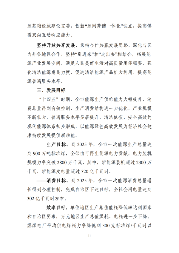 生產(chǎn)目標(biāo):到2025年,全市一次能源生產(chǎn)總量達(dá)到900萬噸標(biāo)準(zhǔn)煤,全部由可再生能源電力貢獻(xiàn)。電力裝機規(guī)模力爭突破2800萬千瓦,其中,新能源裝機超過2300萬千瓦,新能源發(fā)電量超過320億千瓦時。