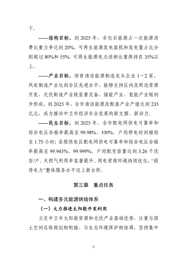 12月14日,寧夏中衛(wèi)市發(fā)改委發(fā)布《中衛(wèi)市能源產(chǎn)業(yè)發(fā)展“十四五”規(guī)劃(征求意見稿)》。意見稿顯示,“十四五”期間,全市提出發(fā)展目標(biāo),能源生產(chǎn)供給能力大幅提升,消費總量得到有效控制,生產(chǎn)消費結(jié)構(gòu)進一步優(yōu)化,產(chǎn)業(yè)規(guī)模不斷壯大,普遍服務(wù)水平顯著提升,清潔低碳、安全高效的現(xiàn)代能源體系初步形成,以能源綠色高效發(fā)展為經(jīng)濟社會健康持續(xù)發(fā)展提供新動能。