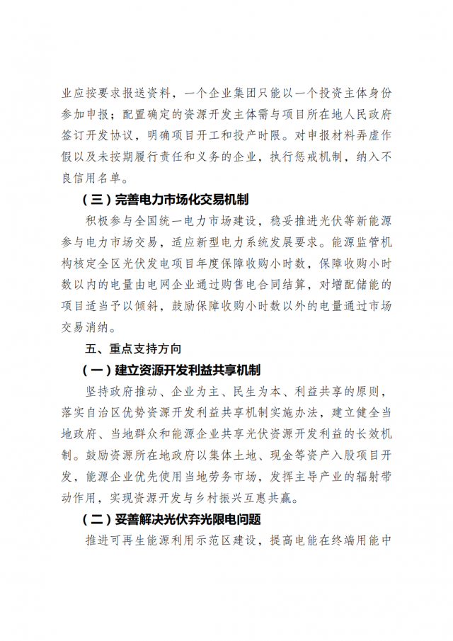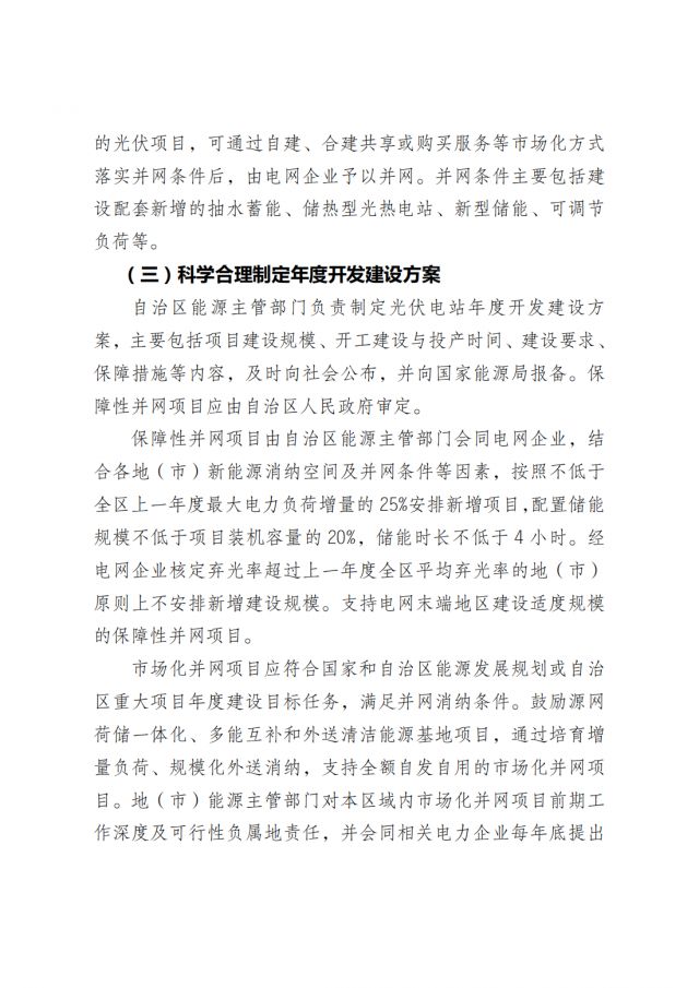 積極參與全國(guó)統(tǒng)一電力市場(chǎng)建設(shè),穩(wěn)妥推進(jìn)光伏等新能源參與電力市場(chǎng)交易,適應(yīng)新型電力系統(tǒng)發(fā)展要求。能源監(jiān)管機(jī)構(gòu)核定全區(qū)光伏發(fā)電項(xiàng)目年度保障收購(gòu)小時(shí)數(shù),保障收購(gòu)小時(shí)數(shù)以?xún)?nèi)的電量由電網(wǎng)企業(yè)通過(guò)購(gòu)售電合同結(jié)算,對(duì)增配儲(chǔ)能的項(xiàng)目適當(dāng)予以?xún)A斜,鼓勵(lì)保障收購(gòu)小時(shí)數(shù)以外的電量通過(guò)市場(chǎng)交易消納。