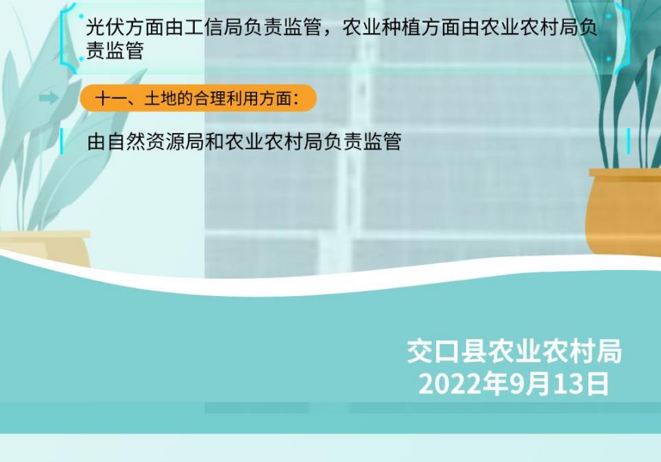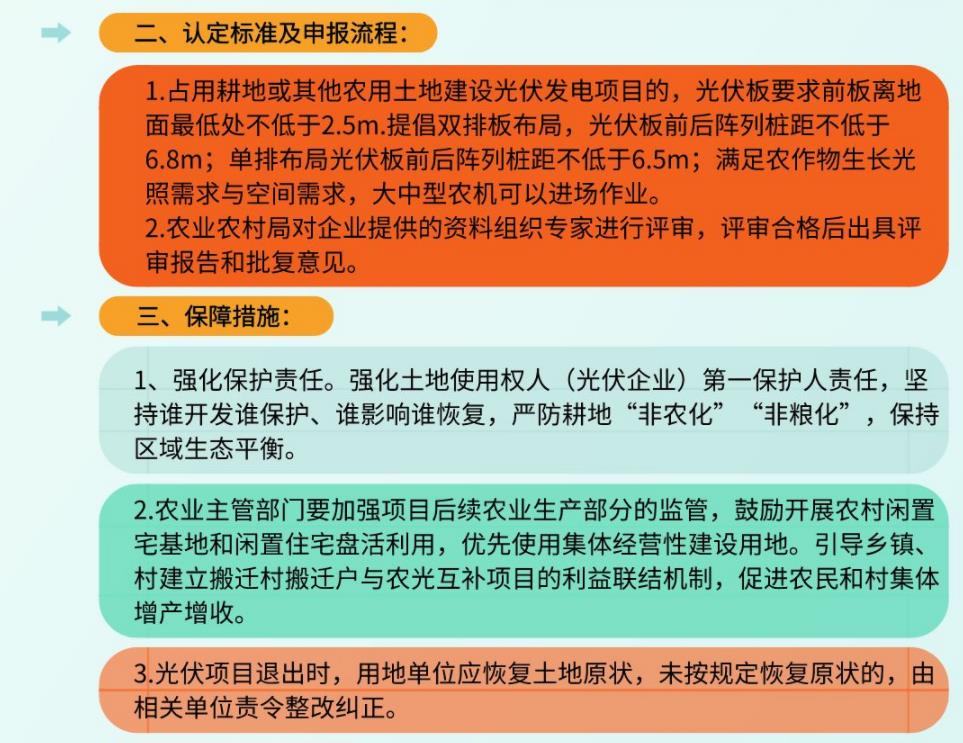 4、采用“農(nóng)光互補(bǔ)”模式使用永久基本農(nóng)田以外的耕地建設(shè)光伏復(fù)合項(xiàng)目的,需縣級(jí)農(nóng)業(yè)農(nóng)村部門(mén)出具不影響農(nóng)業(yè)生產(chǎn)的意見(jiàn)后實(shí)施。項(xiàng)目開(kāi)工前,企業(yè)需與所在縣、村委、農(nóng)戶簽訂三方補(bǔ)償協(xié)議,報(bào)縣級(jí)自然資源和農(nóng)業(yè)農(nóng)村部門(mén)備案。
