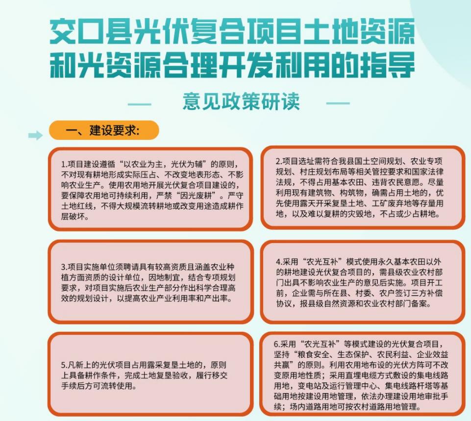 1月28日,山西省呂梁市交口縣人民政府印發(fā)《交口縣光伏復(fù)合項(xiàng)目土地資源和光資源合理開(kāi)發(fā)利用的指導(dǎo)性意見(jiàn)》,意見(jiàn)要求:項(xiàng)目建設(shè)遵循“以農(nóng)業(yè)為主,光伏為輔”的原則,不對(duì)現(xiàn)有耕地形成實(shí)際壓占、不改變地表形態(tài)、不影響農(nóng)業(yè)生產(chǎn)。使用農(nóng)用地開(kāi)展光伏復(fù)合項(xiàng)目建設(shè)的,要保障農(nóng)用地可持續(xù)利用,嚴(yán)禁“因光廢耕”。嚴(yán)守土地紅線,不得大規(guī)模流轉(zhuǎn)耕地或改變用途造成耕作層破壞。項(xiàng)目選址需符合我縣國(guó)土空間規(guī)劃、農(nóng)業(yè)專項(xiàng)規(guī)劃、村莊規(guī)劃布局等相關(guān)管控要求和國(guó)家法律法規(guī),不得占用基本農(nóng)田、違背農(nóng)民意愿。盡量利用現(xiàn)有建筑物、構(gòu)筑物,確需占用土地的,優(yōu)先使用露天開(kāi)采復(fù)墾土地、工礦廢棄地等存量用地,以及難以復(fù)耕的災(zāi)毀地,不占或少占耕地。