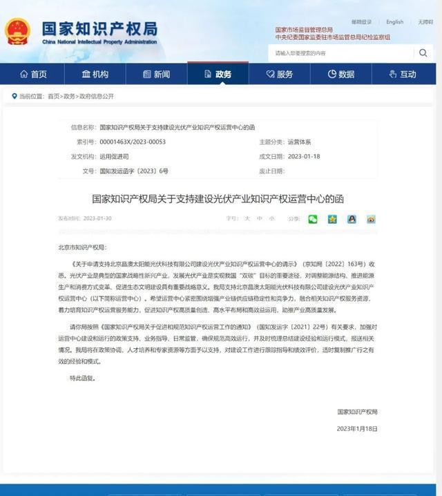 1月30日,國(guó)家知識(shí)產(chǎn)權(quán)局發(fā)布《關(guān)于支持建設(shè)光伏產(chǎn)業(yè)知識(shí)產(chǎn)權(quán)運(yùn)營(yíng)中心的函》,明確支持北京晶澳太陽(yáng)能光伏科技有限公司(以下簡(jiǎn)稱“晶澳科技”)建設(shè)“光伏產(chǎn)業(yè)知識(shí)產(chǎn)權(quán)運(yùn)營(yíng)中心”。這是光伏制造領(lǐng)域(不含多晶硅)首個(gè)國(guó)家級(jí)知識(shí)產(chǎn)權(quán)運(yùn)營(yíng)中心,體現(xiàn)了國(guó)家對(duì)晶澳科技在光伏制造領(lǐng)域科技實(shí)力和知識(shí)產(chǎn)權(quán)運(yùn)作能力的肯定。
