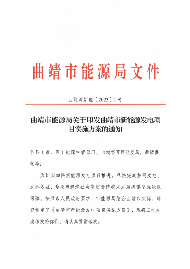 2月8日,曲靖市能源局關(guān)于印發(fā)曲靖市新能源發(fā)電項(xiàng)目實(shí)施方案的通知。通知顯示,為切實(shí)加快新能源發(fā)電項(xiàng)目推進(jìn),盡快完成并網(wǎng)發(fā)電、發(fā)揮效益,曲靖市全力推進(jìn)全市總裝機(jī)976.1萬千瓦、總投資523.53億元的75個(gè)在建風(fēng)電、光伏項(xiàng)目建設(shè),確保2023年完成并網(wǎng)350萬千瓦,完成投資100億元。