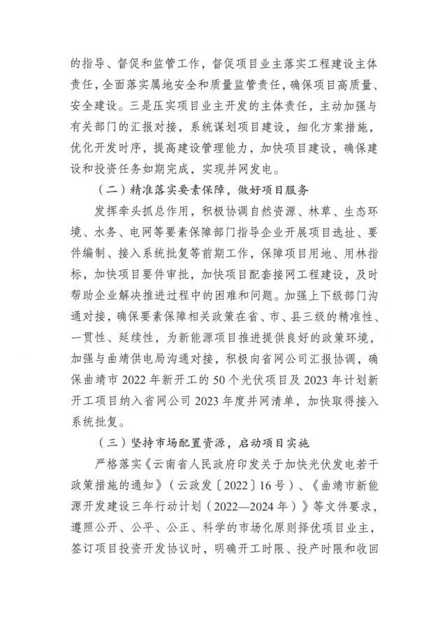 同時(shí),確保曲靖市2022年新開工的50個(gè)光伏項(xiàng)目及2023年計(jì)劃新開工項(xiàng)目納入省網(wǎng)公司2023年度并網(wǎng)清單,加快取得接入系統(tǒng)批復(fù)。
