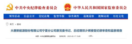 中央紀(jì)委國(guó)家監(jiān)委網(wǎng)站2月17日消息,據(jù)中國(guó)大唐集團(tuán)有限公司紀(jì)檢監(jiān)察組、寧夏回族自治區(qū)監(jiān)察委員會(huì)消息:大唐新能源股份有限公司寧夏分公司原黨委書記、總經(jīng)理鄧少輝涉嫌嚴(yán)重違紀(jì)違法,目前正接受中國(guó)大唐集團(tuán)有限公司紀(jì)檢監(jiān)察組紀(jì)律審查和寧夏回族自治區(qū)銀川市監(jiān)察委員會(huì)監(jiān)察調(diào)查。