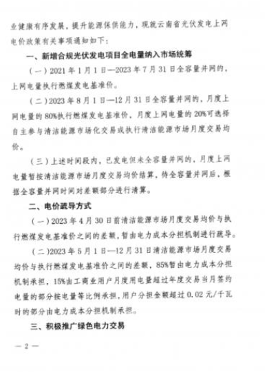 4月3日,云南省發(fā)展和改革委員會、云南省能源局發(fā)布了《關于云南省光伏發(fā)電上網(wǎng)電價政策有關事項的通知》。該政策自2023年4月1日起執(zhí)行。通知顯示,為進一步發(fā)揮市場配置資源的決定性作用,促進光伏發(fā)電產(chǎn)業(yè)健康有序發(fā)展,提升能源保供能力,云南省對新增合規(guī)光伏發(fā)電項目全電量納入市場統(tǒng)籌。
