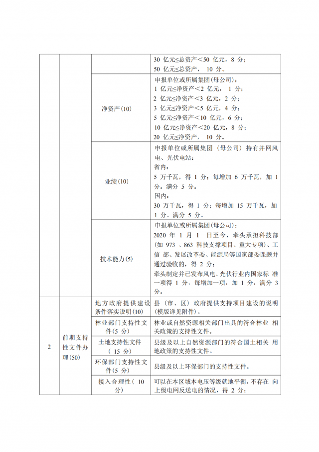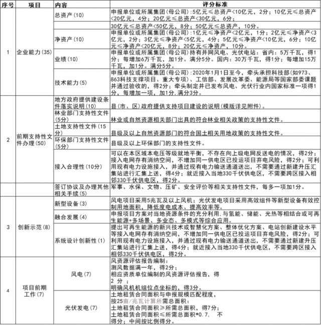 在光伏、風(fēng)電競(jìng)爭(zhēng)性配置評(píng)分細(xì)則上,要求申報(bào)單位須在陜西省境內(nèi)注冊(cè),具有獨(dú)立法人資格或省級(jí)分公司,生產(chǎn)經(jīng)營(yíng)正常。申報(bào)單位或所屬集團(tuán)(母公司)總資產(chǎn)不小于5億元。另外,一個(gè)集團(tuán)公司(含所有下屬公司)納入全省年度建設(shè)規(guī)模不超過(guò)總規(guī)模的20%。具體評(píng)分細(xì)則如下: