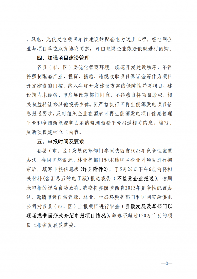 通知顯示,陜西省開(kāi)展競(jìng)爭(zhēng)性配置,確定2023年度新增風(fēng)電、光伏發(fā)電保障性并網(wǎng)規(guī)模為1000萬(wàn)千瓦。為確保項(xiàng)目質(zhì)量,保障市級(jí)權(quán)限,本次項(xiàng)目申報(bào)按照1:1.5的比例,結(jié)合區(qū)域資源條件、負(fù)荷特征和外送通道配套風(fēng)電、光伏發(fā)電項(xiàng)目的實(shí)際,對(duì)各市申報(bào)規(guī)模進(jìn)行明確,由各市共申報(bào)1500萬(wàn)千瓦,省發(fā)展改革委依據(jù)競(jìng)爭(zhēng)性配置辦法統(tǒng)一確定1000萬(wàn)千瓦納入2023年度建設(shè)方案。