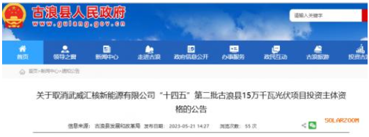 5日21日,甘肅省古浪縣發(fā)展和改革局發(fā)布《關(guān)于取消武威匯核新能源有限公司“十四五”第二批古浪縣15萬千瓦光伏項(xiàng)目投資主體資格的公告》,宣布取消中核匯能甘肅新能源有限公司古浪縣15萬千瓦光伏項(xiàng)目投資主體資格。