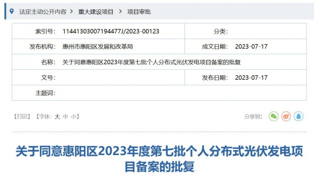 你單位報(bào)來《關(guān)于惠陽區(qū)2023年度第七批個(gè)人分布式光伏發(fā)電項(xiàng)目申請(qǐng)備案的請(qǐng)示》(惠陽供電〔2023〕90號(hào))收悉。經(jīng)研究,現(xiàn)就項(xiàng)目備案事項(xiàng)批復(fù)如下: