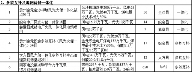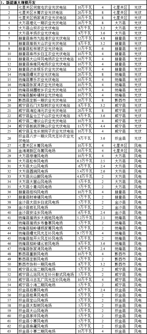 根據(jù)畢節(jié)市新型綜合能源基地建設重點項目表來看,涉及光伏、風電、風光制氫以及多能互補與源網(wǎng)荷儲一體化多個項目。其中光伏項目約26個,規(guī)模為3.19GW,風電項目為37個,規(guī)模為2.374GW。多能互補以及源網(wǎng)荷儲項目為6個,規(guī)模為11.62GW,光伏1.45GW,風電為1.8GW。其中,國家電投集團畢節(jié)千萬千瓦級綜合能源基地新能源規(guī)劃規(guī)模為8.37GW。