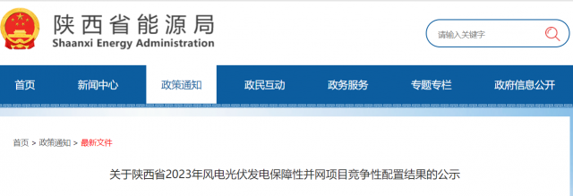 現(xiàn)將2023年陜西省風(fēng)電、光伏發(fā)電保障性并網(wǎng)項目競爭性配置結(jié)果進行公示。公示時間為2023年8月25日至2023年8月31日,如有異議,請在公示期內(nèi)以書面實名反映。