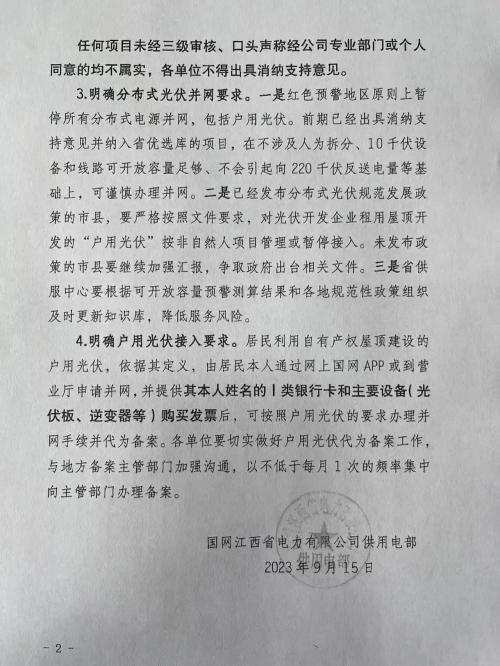 據(jù)網(wǎng)絡(luò)媒體消息:近日,國網(wǎng)江西省下發(fā)《關(guān)于進一步明確分布式光伏消納和并網(wǎng)服務(wù)有關(guān)事項的通知》,明確要求紅色預(yù)警地區(qū)暫停戶用光伏并網(wǎng),對光伏開發(fā)企業(yè)租用屋頂開發(fā)的“戶用光伏”按非自然人項目管理或暫停接入,加強出具“消納意見”的管理,任何項目未經(jīng)三級審核均不得出具消納意見。