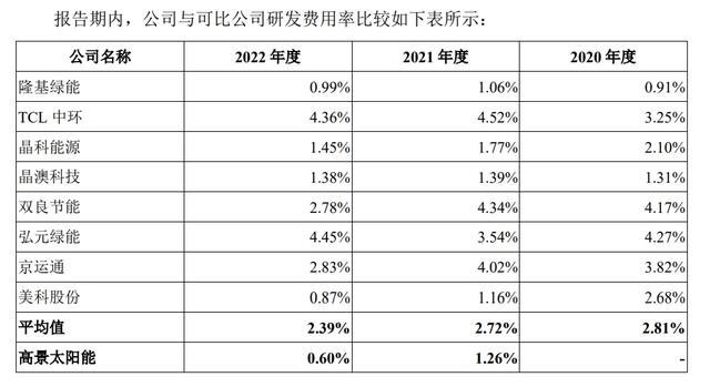 但高景太陽能與同行相比,研發(fā)投入占營收比例較低。招股書數(shù)據(jù)顯示,2020年,高景太陽能未發(fā)生研發(fā)費用。2021-2022年,高景太陽能研發(fā)費用分別約3143.15萬元、1.06億元,占當期營收比重僅為1.26%和0.6%。作為光伏產(chǎn)業(yè)鏈企業(yè),研發(fā)費用過低或?qū)⒂绊懝竞罄m(xù)經(jīng)營潛力。