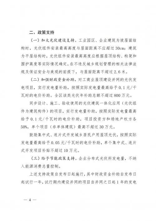 政策方面,文件指出,對(duì)工商業(yè)屋頂建設(shè)并網(wǎng)的光伏發(fā)電項(xiàng)目,實(shí)行發(fā)電量補(bǔ)助,按照實(shí)際發(fā)電量最高給予0.1元/千瓦時(shí)的電價(jià)補(bǔ)助。全區(qū)該類(lèi)光伏年補(bǔ)助總額不超過(guò)800萬(wàn)元。同步設(shè)計(jì)、施工、驗(yàn)收使用的光伏建筑一體化應(yīng)用(光伏組件為建筑構(gòu)件)的項(xiàng)目,實(shí)行發(fā)電量補(bǔ)助,按照實(shí)際發(fā)電量最高給予0.1元/千瓦時(shí)的電價(jià)補(bǔ)助,項(xiàng)目投資方和場(chǎng)地產(chǎn)權(quán)方各50%,單個(gè)項(xiàng)目(非單體建筑)最高不超過(guò)30萬(wàn)元。鼓勵(lì)集中式、連片式開(kāi)發(fā)城鄉(xiāng)居民戶用屋頂光伏,按照實(shí)際發(fā)電量最高給予0.05元/千瓦時(shí)的電價(jià)補(bǔ)助,單個(gè)集中式、連片式開(kāi)發(fā)項(xiàng)目補(bǔ)貼不超過(guò)10萬(wàn)元。
