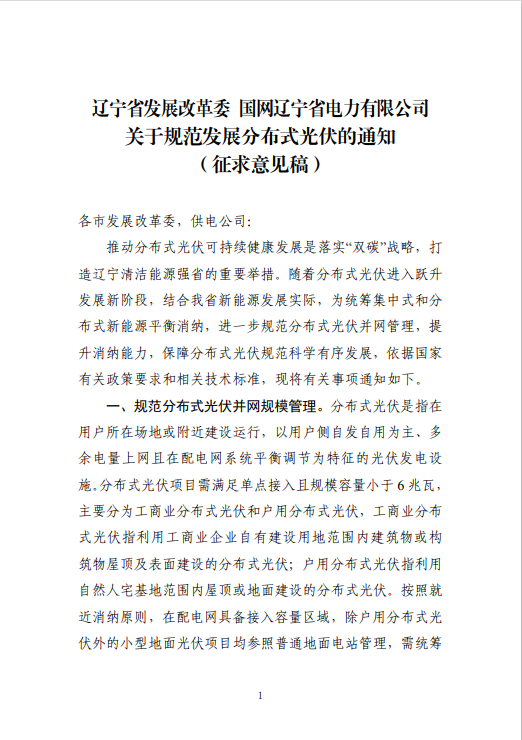 2023年11月28日,遼寧省發(fā)展改革委發(fā)布了關(guān)于規(guī)范發(fā)展分布式光伏的通知(征求意見(jiàn)稿)》 公開(kāi)征求意見(jiàn)的公告。