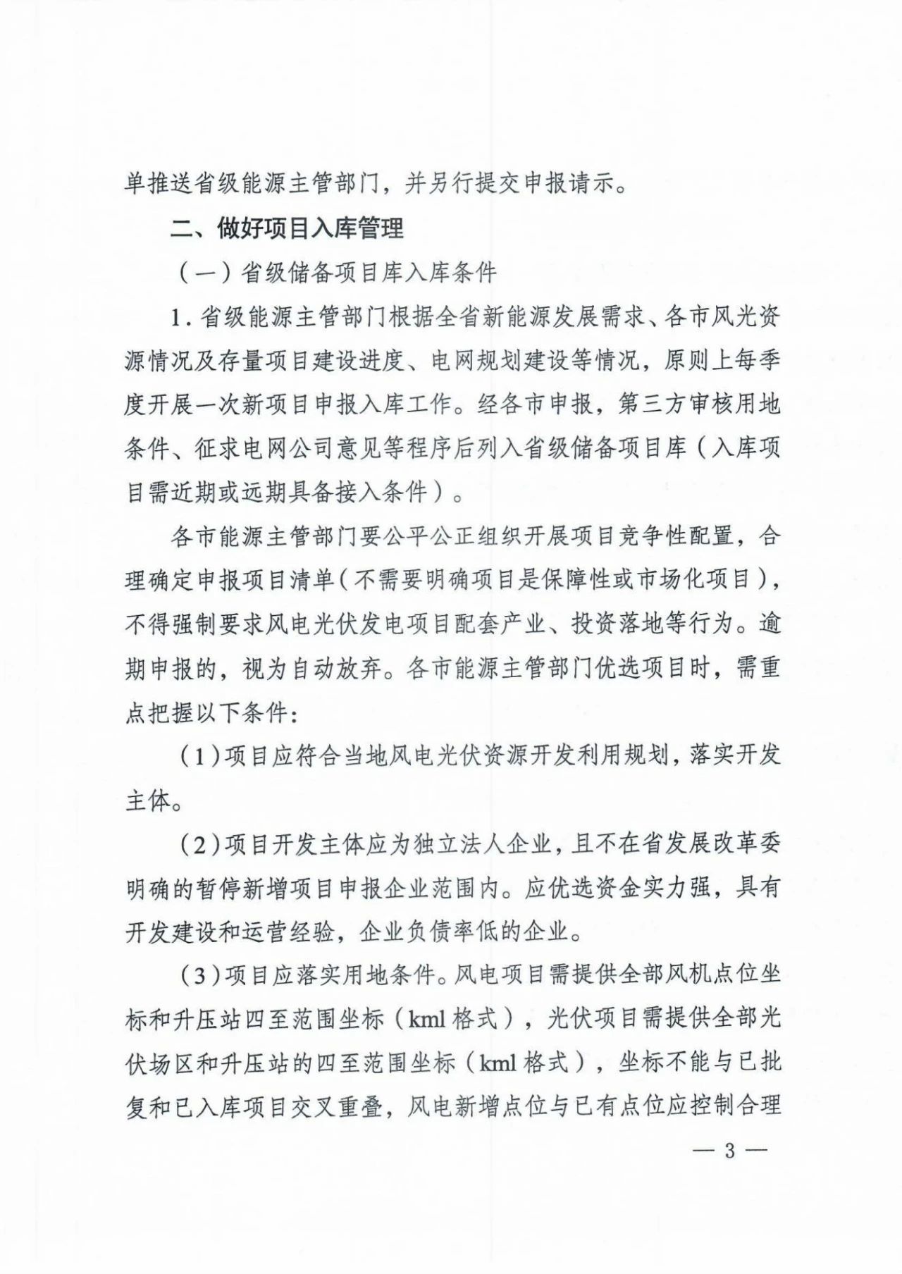 各市需公平開(kāi)展項(xiàng)目競(jìng)配,無(wú)需確定項(xiàng)目類(lèi)型,但不得強(qiáng)制要求產(chǎn)業(yè)配套、投資落地等。項(xiàng)目應(yīng)落實(shí)用地條件,風(fēng)電項(xiàng)目需提供全部風(fēng)機(jī)點(diǎn)位坐標(biāo)和升壓站四至范圍坐標(biāo)(kml格式),光伏項(xiàng)目需提供全部光伏場(chǎng)區(qū)和升壓站的四至范圍坐標(biāo)(kml格式),坐標(biāo)不能與已批復(fù)和已入庫(kù)項(xiàng)目交叉重疊。項(xiàng)目應(yīng)承諾按要求配置儲(chǔ)能等調(diào)峰設(shè)施,入庫(kù)時(shí)不需要明確配置比例,出庫(kù)時(shí)按當(dāng)年開(kāi)發(fā)建設(shè)方案要求配置儲(chǔ)能。