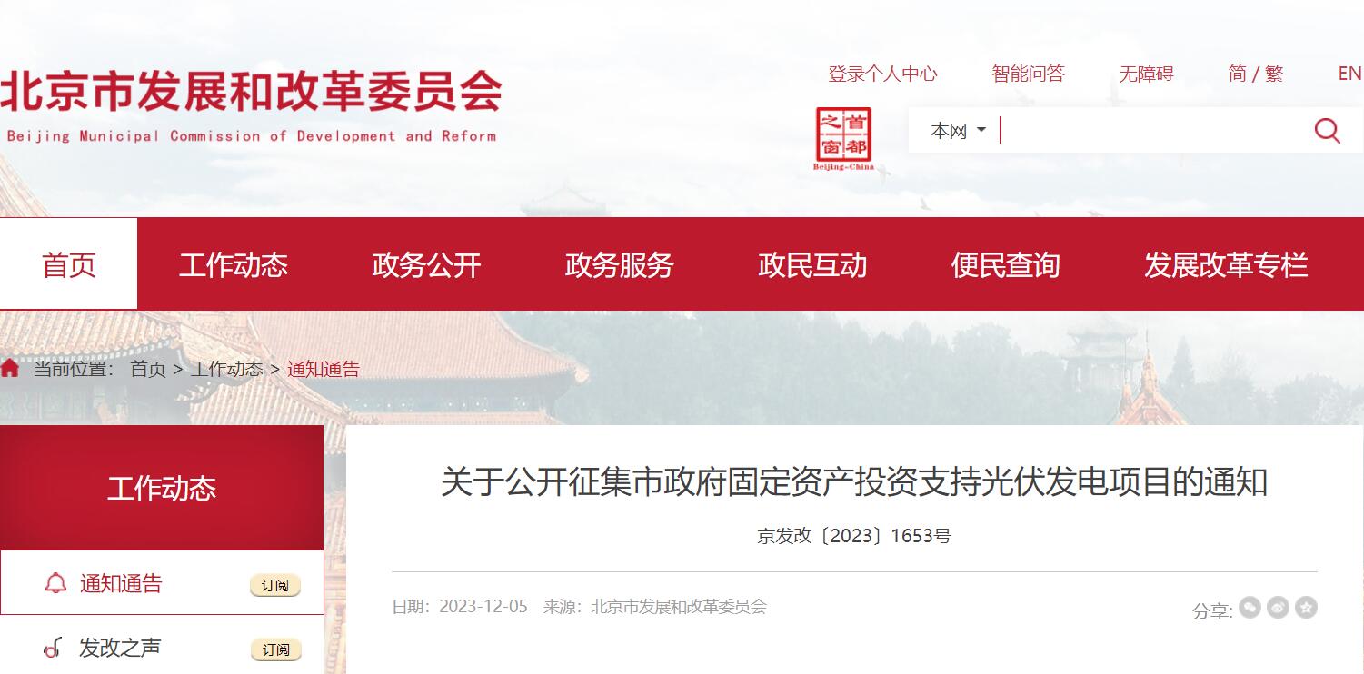 按照《北京市發(fā)展和改革委員會等4部門關(guān)于印發(fā)推進光伏發(fā)電高質(zhì)量發(fā)展支持政策的通知》(京發(fā)改規(guī)〔2023〕4號,以下簡稱《支持政策》)要求,申報市政府固定資產(chǎn)投資支持的光伏項目需通過公開征集和評估,現(xiàn)開展2023年第二批市政府固定資產(chǎn)投資光伏項目公開征集工作,有關(guān)事項通知如下: