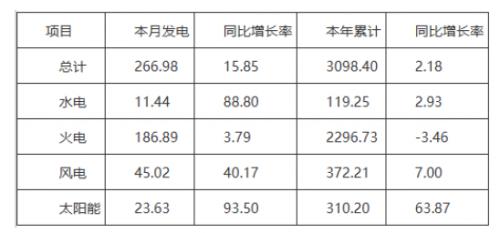 (一)發(fā)電量情況。11月份當(dāng)月,全省發(fā)電量266.98億千瓦時(shí),同比增加15.85%。其中水電11.44億千瓦時(shí),同比增加88.80%;火電186.89億千瓦時(shí),同比增加3.79%;風(fēng)電45.02億千瓦時(shí),同比增加40.17%;太陽能23.63億千瓦時(shí),同比增加93.50%。