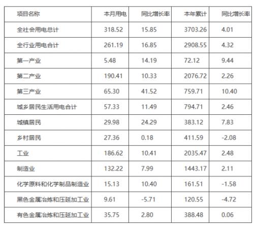 (一)全社會(huì)用電量情況。全省全社會(huì)用電量318.52億千瓦時(shí),同比增加15.85%;累計(jì)用電量3703.26億千瓦時(shí),同比增加4.01%。