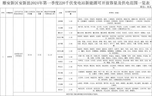 根據(jù)《雄安新區(qū)安新縣2024年第一季度220千伏變電站新能源可開放容量及供電范圍一覽表》,安新縣13個鄉(xiāng)鎮(zhèn)2024年第一季度可開放容量為31.18兆瓦。