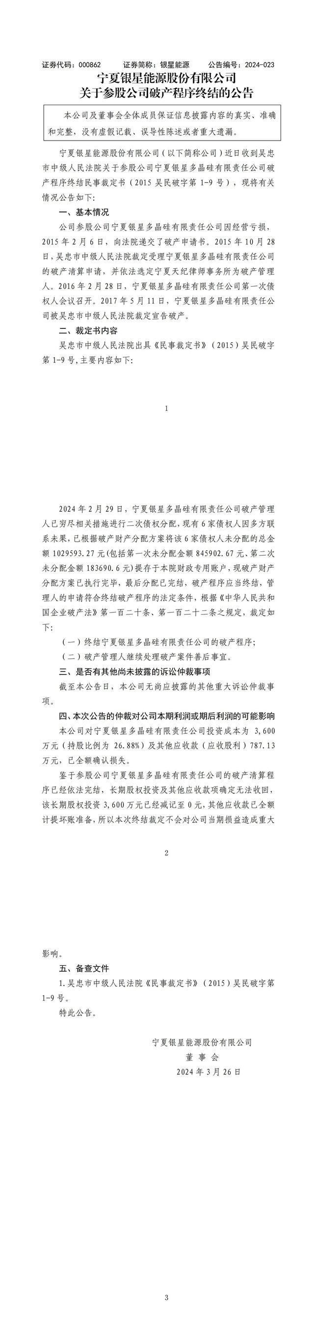 公司參股公司寧夏銀星多晶硅有限責(zé)任公司因經(jīng)營(yíng)虧損,2015年2月6日,向法院遞交了破產(chǎn)申請(qǐng)書(shū)。2015年10月28日,吳忠市中級(jí)人民法院裁定受理寧夏銀星多晶硅有限責(zé)任公司的破產(chǎn)清算申請(qǐng),并依法選定寧夏天紀(jì)律師事務(wù)所為破產(chǎn)管理人。2016年2月28日,寧夏銀星多晶硅有限責(zé)任公司第一次債權(quán)人會(huì)議召開(kāi)。2017年5月11日,寧夏銀星多晶硅有限責(zé)任公司被吳忠市中級(jí)人民法院裁定宣告破產(chǎn)。2024年2月29日,吳忠市中級(jí)人民法院裁定如下:終結(jié)寧夏銀星多晶硅有限責(zé)任公司的破產(chǎn)程序,破產(chǎn)管理人繼續(xù)處理破產(chǎn)案件善后事宜。