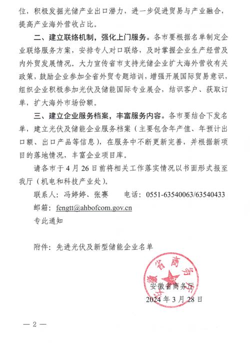 文件要求,各市要根據(jù)名單制定企業(yè)聯(lián)絡(luò)服務(wù)方案,安排專人對口聯(lián)絡(luò),及時(shí)掌握企業(yè)生產(chǎn)經(jīng)營及內(nèi)外貿(mào)發(fā)展情況。大力宣傳省市支持光儲企業(yè)擴(kuò)大海外營收有關(guān)政策,鼓勵企業(yè)參加全省外貿(mào)專題培訓(xùn),增強(qiáng)開展國際貿(mào)易意識組織企業(yè)積極參加光伏及儲能國際專業(yè)展會,結(jié)識客戶、獲取訂單,擴(kuò)大海外市場份額。