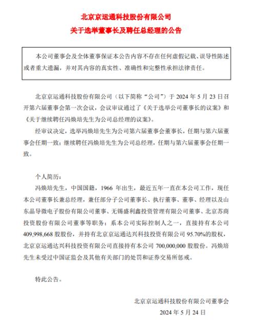 5月24日,京運(yùn)通發(fā)布關(guān)于選舉董事長及聘任總經(jīng)理的公告。公告表示,5月23日,京運(yùn)通召開第六屆董事會第一次會議,會議審議通過了《關(guān)于選舉公司董事長的議案》和《關(guān)于繼續(xù)聘任馮煥培先生為公司總經(jīng)理的議案》。經(jīng)審議決定,選舉馮煥培為京運(yùn)通第六屆董事會董事長,任期與第六屆董事會任期一致;繼續(xù)聘任馮煥培先生為公司總經(jīng)理,任期與第六屆董事會任期一致。