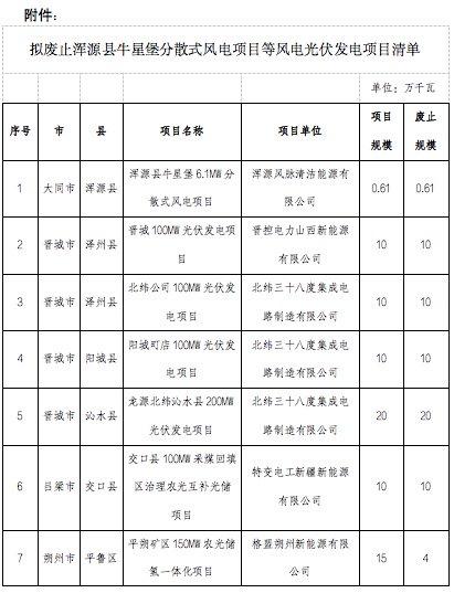 為提高我省新能源項(xiàng)目落地轉(zhuǎn)化率,加快推進(jìn)新能源建設(shè)進(jìn)度,我局組織各市能源局對(duì)2022年及之前取得批復(fù)且尚未全容量并網(wǎng)的風(fēng)電、光伏發(fā)電項(xiàng)目進(jìn)行了梳理。相關(guān)地市上報(bào)了擬廢止或核減規(guī)模項(xiàng)目清單,經(jīng)我局匯總,擬廢止渾源縣牛星堡分散式風(fēng)電等12個(gè)項(xiàng)目、規(guī)模91.981萬(wàn)千瓦,現(xiàn)予以公示。相關(guān)企業(yè)如有異議,請(qǐng)向相關(guān)市能源局提出書面意見(jiàn),并在公示期(5個(gè)工作日)內(nèi),由市能源局上報(bào)省能源局。