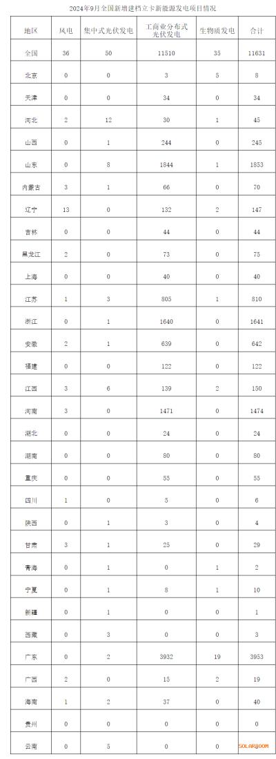 9月,全國(guó)新增建檔立卡新能源發(fā)電(不含戶用光伏)項(xiàng)目共11631個(gè),其中風(fēng)電項(xiàng)目36個(gè),光伏發(fā)電項(xiàng)目11560個(gè)(集中式光伏發(fā)電項(xiàng)目50個(gè),工商業(yè)分布式光伏發(fā)電項(xiàng)目11510個(gè)),生物質(zhì)發(fā)電項(xiàng)目35個(gè)。